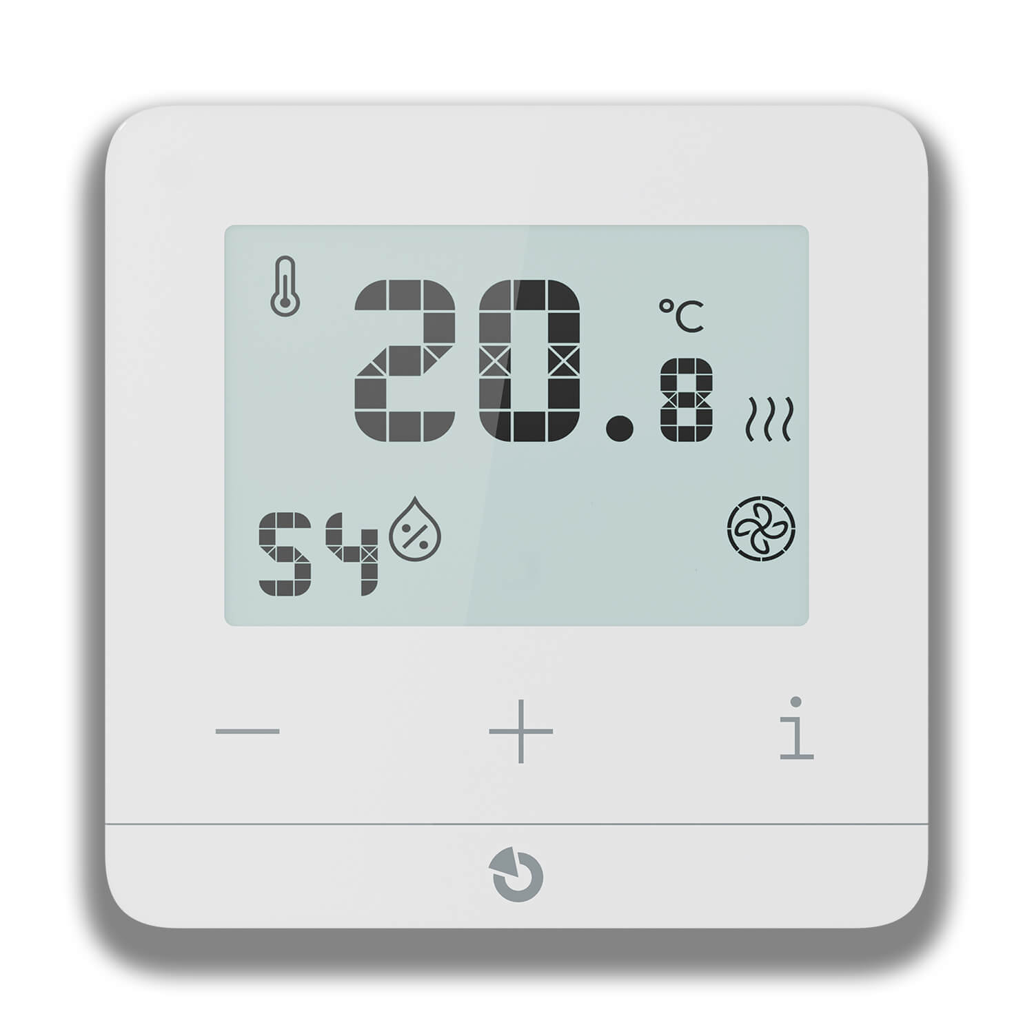 Die lokale Steuerung könnte nicht einfacher sein. Verwenden Sie die Plus- und Minus-Tasten, um die gewünschte Temperatur einzustellen, und die „i“-Taste, um zwischen der Anzeige der gemessenen Raum- und Bodentemperaturen und der eingestellten Temperatur zu wechseln. Keine komplizierte Programmierung oder Menüs.